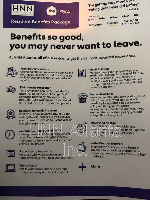 All HNN Atlanta residents are enrolled in the Resident Benefits Package (RBP) for $40/month which includes renters insurance, HVAC air filter delivery (for applicable properties), credit building to help boost your credit score with timely rent payments, $1M Identity Protection, move-in concierge service making utility connection and home service setup a breeze during your move-in, our best-in-class resident rewards program, and much more! More details upon application.